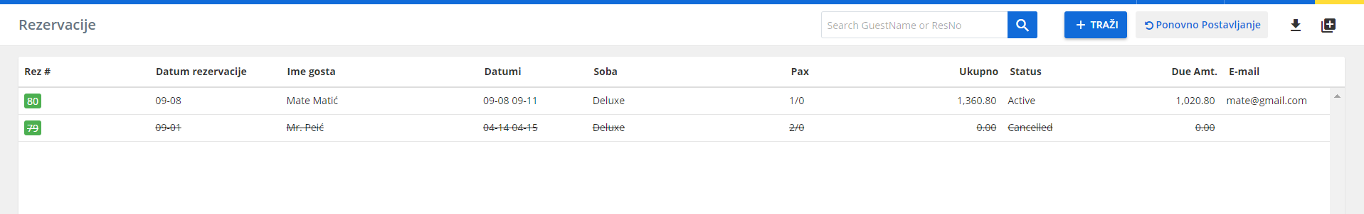 Prečacu „Rezervacije“ pristupite na glavnoj alatnoj traci (treća ikonica slijeva). Sada će vam se prikazati sve aktivne i otkazane rezervacije.